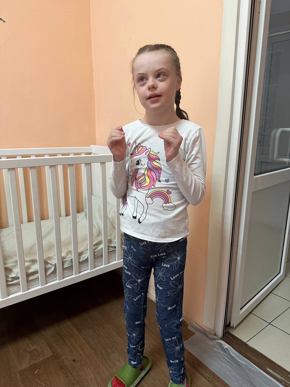 Дитина з інвалідністю, емоційна, любить спілкування, але іноді може бути впертою або емоційно нестабільною. Себе не обслуговує. Мова не розвинена.