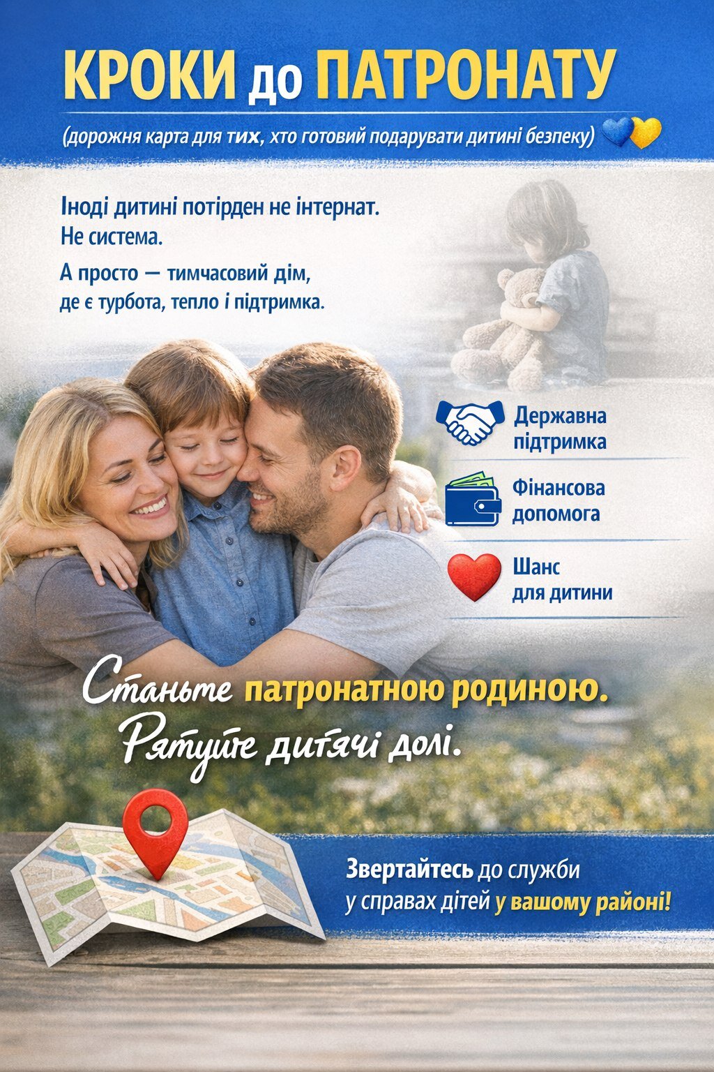 Саме для цього існує патронат над дитиною — форма тимчасового влаштування, коли дитина отримує догляд, виховання та допомогу у сім’ї на період подолання складних життєвих обставин.